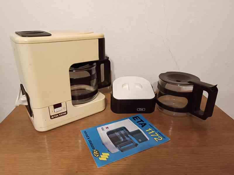 Prodám elektrický kávovar ETA 1172 (2 sady filtru a konvic – káva a čaj, funkční, ulomený držák pro síťový kabel – možno přilepit).