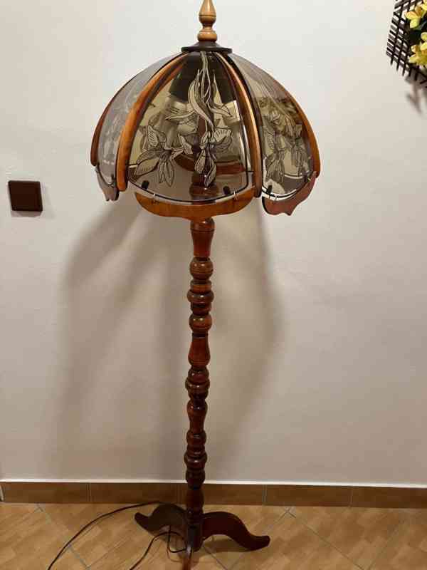 Rustikální lampa a lustr. Lampa: 2x60 W, včetně úsporných zářivek 23 W (Osram) a 22 W, výška 165 cm, průměr stínítka 42 cm, dřevěná trojnožka se sloupkem, 950 Kč. Lustr: 1x60 W, včetně LED žárovky 25 W, průměr stínítka 45 cm, volitelná samonavíjecí, délka závěsu, 450 Kč. Za oba 1300 Kč. U Obou patice E27, skleněné malované výplně v drátěném rámu, dřevěné dekory. Velmi dobrý stav. Chýně, okr. Praha-západ.