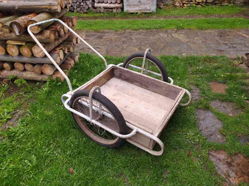 Nabízim dvoukolák s dřevěnou korbou a nafukovacími koly . Nové pláště. Cena nového na trhu 2800 – 3700 Kč . Moje cena 1100 Kč .