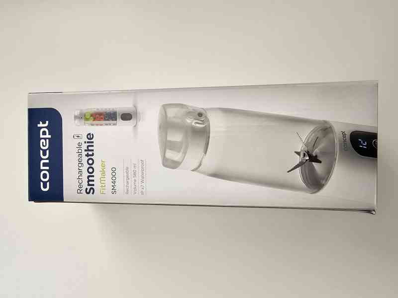 Dobíjecí smoothie FitMaker CONCEPT SM4000 disponuje extra výkonem 17000 otáček za minutu, 6 ostrými sekacími noži, vodotěsným zpracováním, vyjímatelnou nádobou s pítkem o objemu 580 ml a kvalitní Li-Ion baterií s kapacitou 6000 mAh s provozní dobou až 40 cyklů po 20 s. Dobíjí se pomocí USB magnetické nabíječky.
