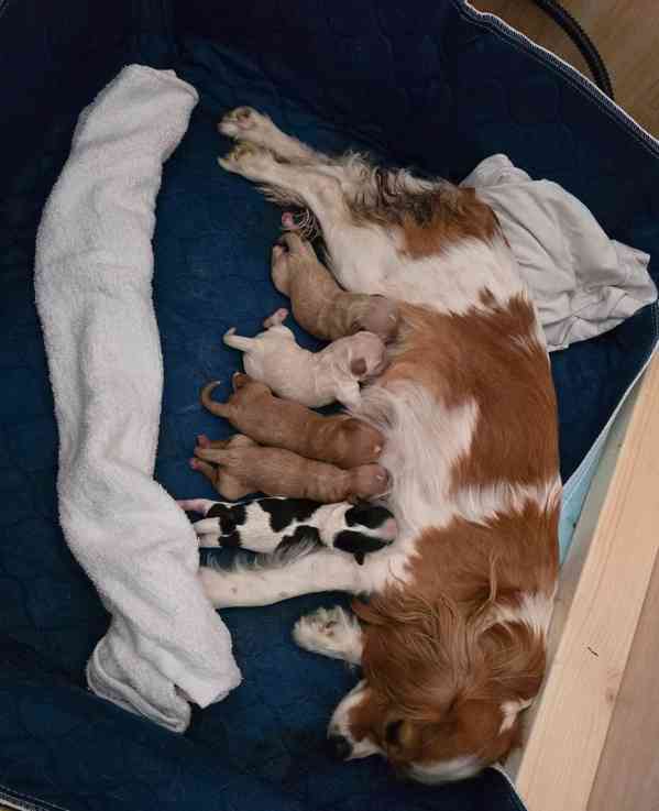 S potěšením představujeme náš krásný vrh pěti štěňat Cavapoo — tři kluky a dvě holky, každé s vlastním šarmem a typickým vzhledem plemene: