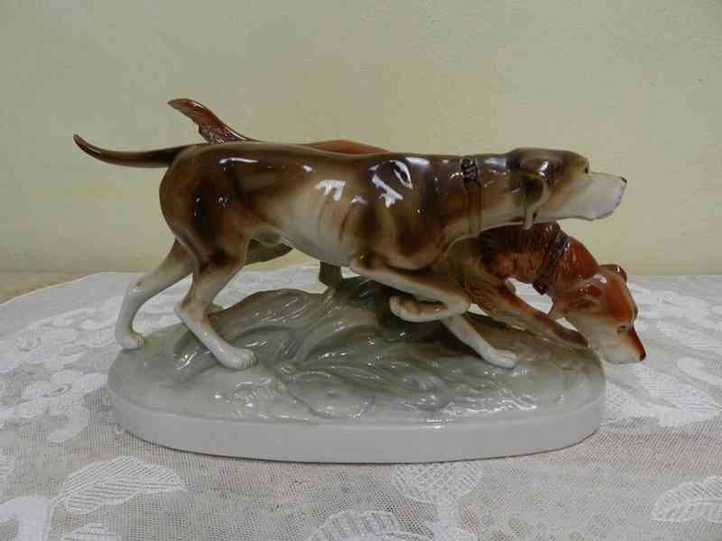 Krásná větší porcelánová soška, Lovečtí Psi - původní série z 60 let 20 stol, Royal Dux Czechoslovakia.