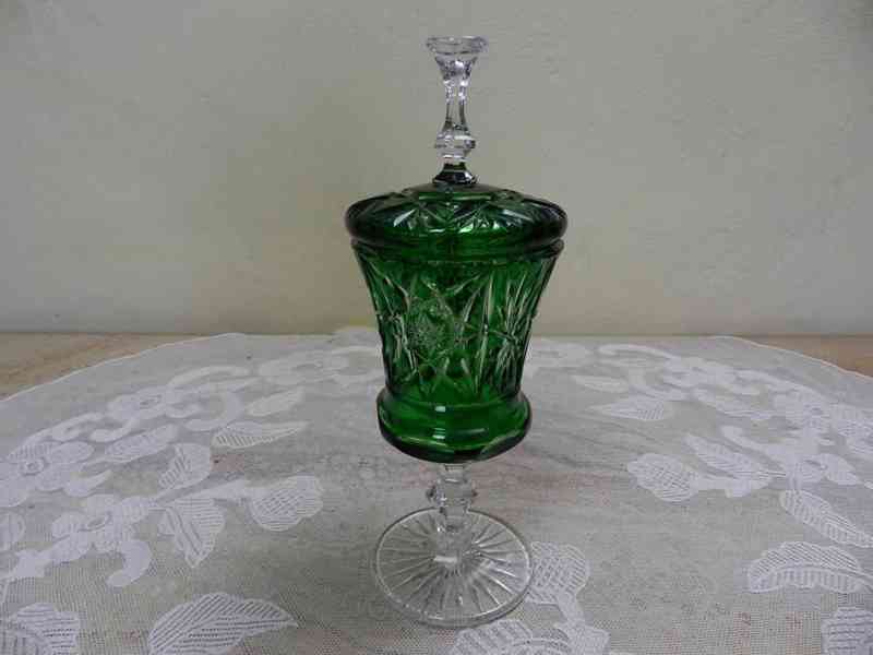 Krásný starý zelený bohatě broušený Pohár s Poklopem, Čechy.
