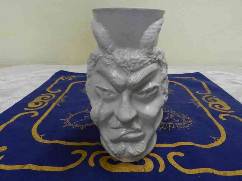 Zajímavý starý figurální porcelánový korbel ve tvaru čerta.