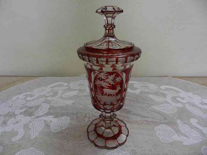 Krásný masivní broušený rubínový Pohár s Poklopem, Srnec, pozdní Biedermeier - Egermann, kolem 1860.