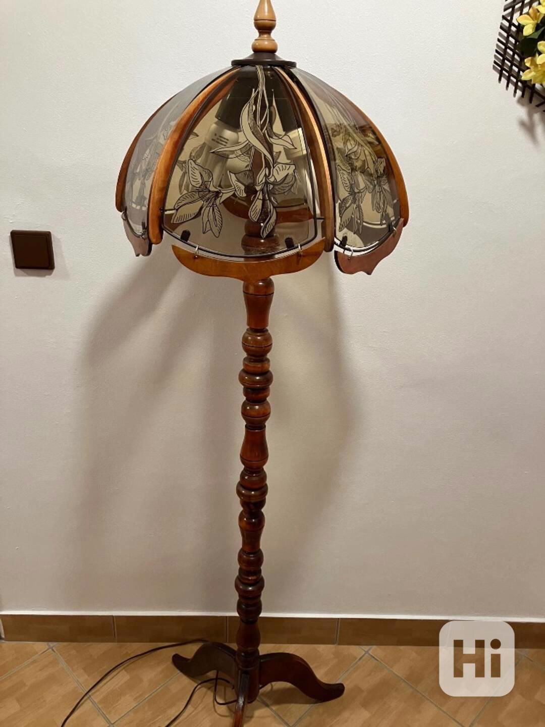 Rustikální lampa a lustr. Lampa: 2x60 W, včetně úsporných zářivek 23 W (Osram) a 22 W, výška 165 cm, průměr stínítka 42 cm, dřevěná trojnožka se sloupkem, 950 Kč. Lustr: 1x60 W, včetně LED žárovky 25 W, průměr stínítka 45 cm, volitelná samonavíjecí, délka závěsu, 450 Kč. Za oba 1300 Kč. U Obou patice E27, skleněné malované výplně v drátěném rámu, dřevěné dekory. Velmi dobrý stav. Chýně, okr. Praha-západ.