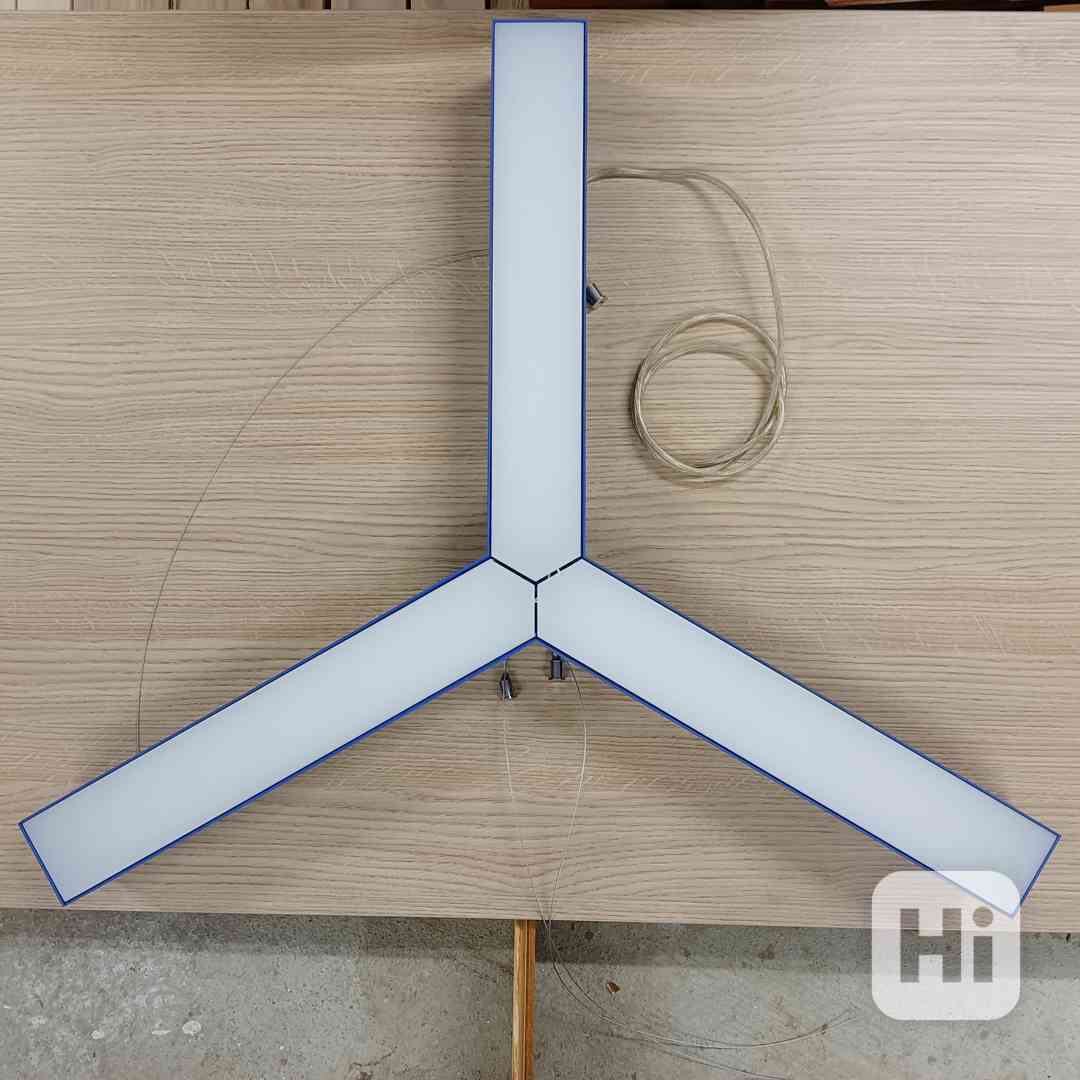 Prosím viz foto... k dispozici jsou případně další dvě světla. Délka ramene 43cm, výška tělesa 9cm. Zavěšení pomocí stavitelných lanek.