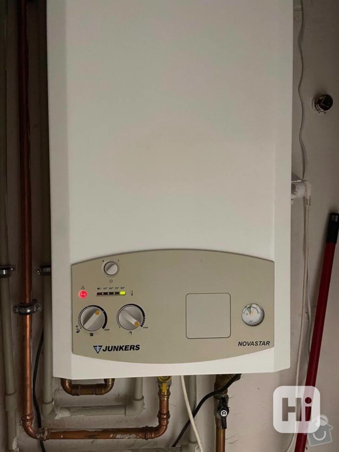 Kombinovaný závěsný plynový kotel Junkers Novastar ZW 23-1AE (turbo přes zeď) s měděným šnekovým výměníkem. Zánovní, funguje, žádné součástky mu nechybí, před pár lety měněna nová ovládací deska, v níž je umístěna řídicí elektronika. Za neporušeným bílým kovovým krytem je kompaktní hydroblok, jehož součástí je deskový výměník, čerpadlo s odvzdušněním, trojcestný ventil, snímač průtoku, dopouštěcí ventil, pojistný 3 bar ventil a čidlo NTC výstupu teplé vody.